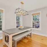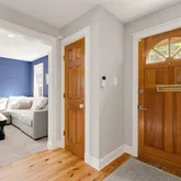 The home has a privately located side entrance, surrounded by meticulously maintained landscaping and mulch beds. Throughout the home, you'll find refinished wide-plank pine floors (2021), custom wood doors, and new craftsman-style interior baseboards and casing (2020) that create seamless flow and timeless appeal.