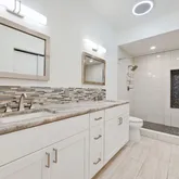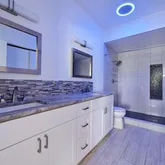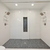 -En-suite bathroom with dual vanities, built-in shelving, built-in bluetooth speaker, blue light nightlight, and a spa-style walk-in shower with dual shower heads