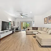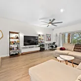 -Bright, open-concept living area. The spacious living room with sliding doors leads to a covered patio