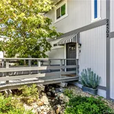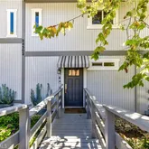 The building exudes classic coastal charm with Cape Cod architecture, decorative window awnings, and an enchanting creek flowing near the entry.