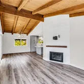 The open-concept living area features a cozy fireplace—perfect for romantic evenings and cooler coastal nights. Easy-care flooring in a neutral tone complements any decor.