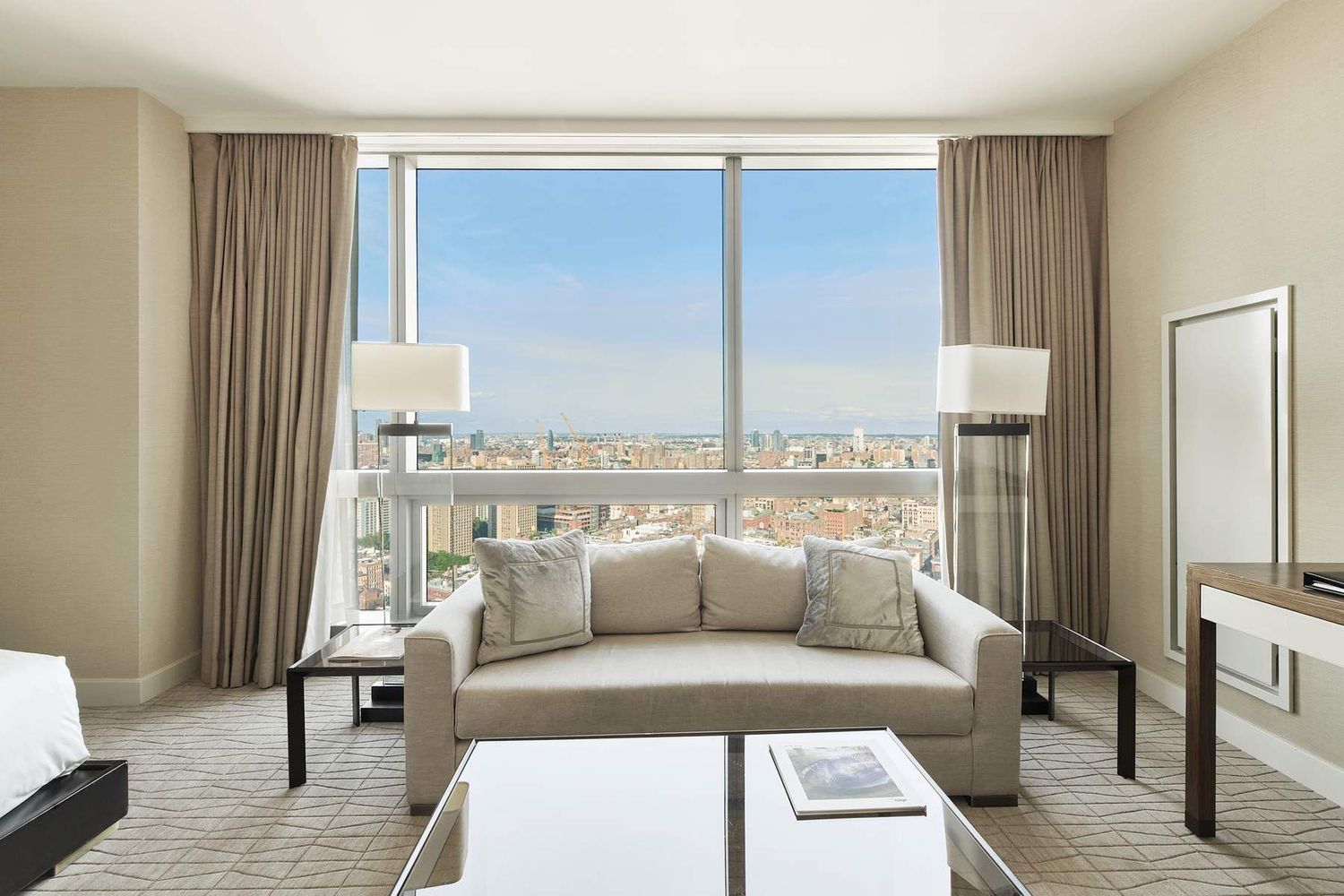 This luxurious 41st-floor unit has one of the most unique studio layouts in the building showcasing corner South and East exposures of the Manhattan skyline. This generous studio floor-plan offers floor-to-ceiling windows and is elegantly furnished with a luxurious king-sized bed, with leather headboard. The windowed Bathroom is wrapped in Italian marble, has a custom vanity, glass-enclosed shower and beautiful soaking tub with unobstructed views.