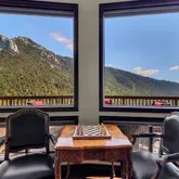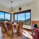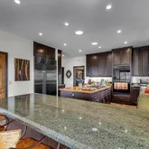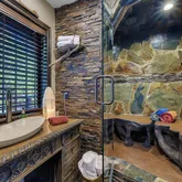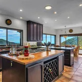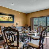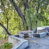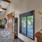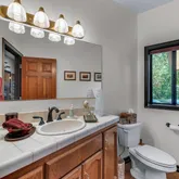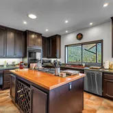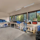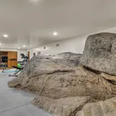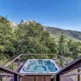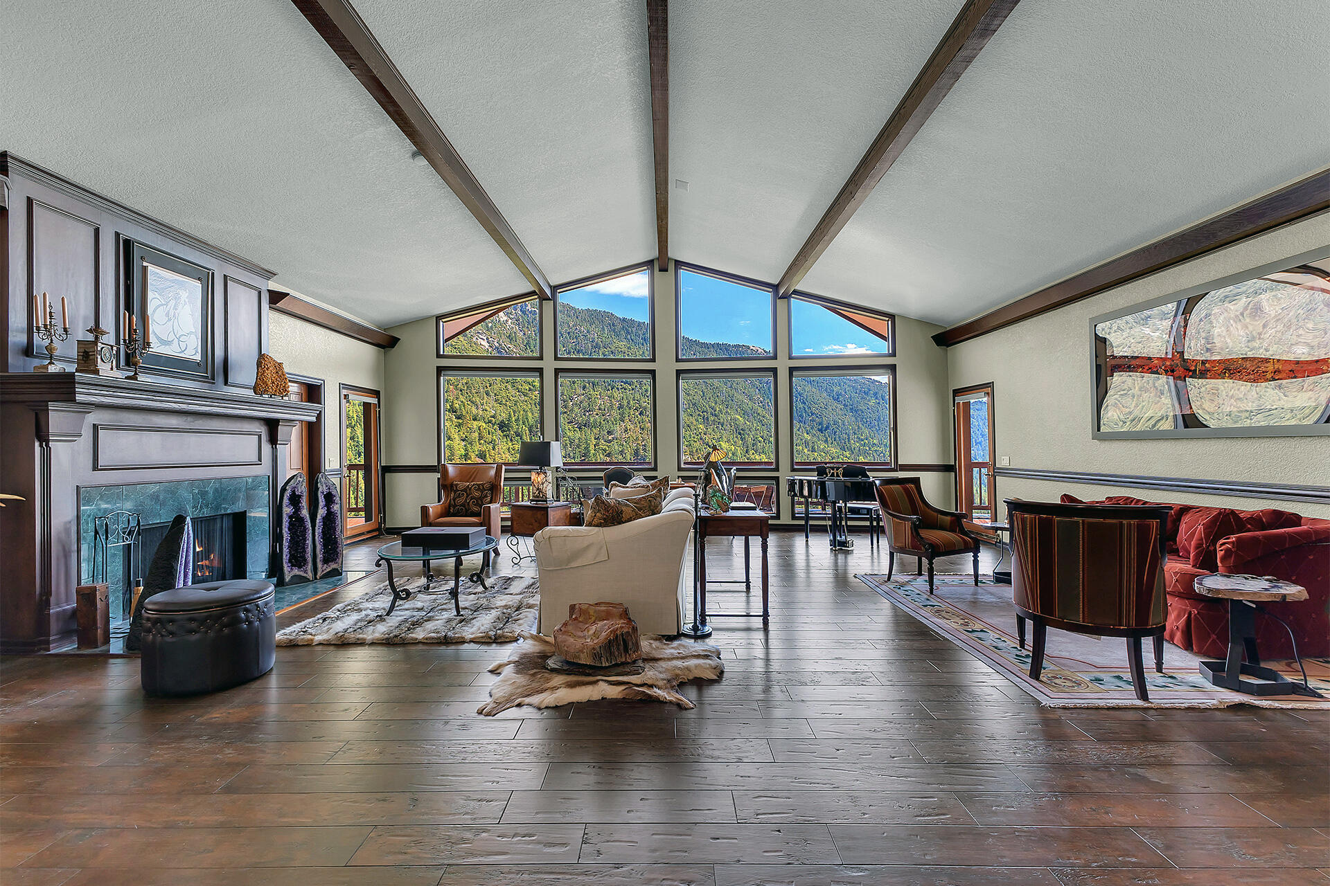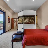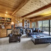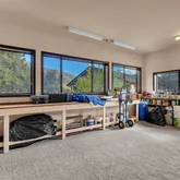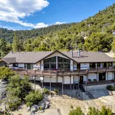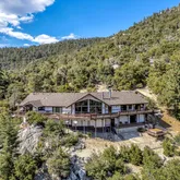Multiple entertaining spaces open to an expansive deck designed to maximize the surrounding vistas. The lower level includes a spacious game room, gym with infrared sauna, TV lounge, and a fourth bedroom suite with a loft bed, steam shower, and direct hot tub access. A detached four-car garage with a workshop provides abundant storage and workspace. Every detail is designed for refined mountain living with privacy, space, and craftsmanship rarely found in Idyllwild.