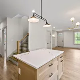 The open-concept layout features upgraded luxury vinyl flooring throughout both the first & second levels--no carpet in sight. The Heart of the Home - A gorgeous chef's kitchen serves as the centerpiece, boasting a large center island, elegant quartz countertops, custom tile backsplash & SS appliances. Thoughtful details include a convenient pot filler over the smooth-top electric range & beautiful custom cabinetry. Gathering Spaces - The inviting family room, centered around a cozy LP gas log FP, flows seamlessly into a dining area designed for hosting memorable gatherings with friends and family. Primary Suite & Private Quarters -