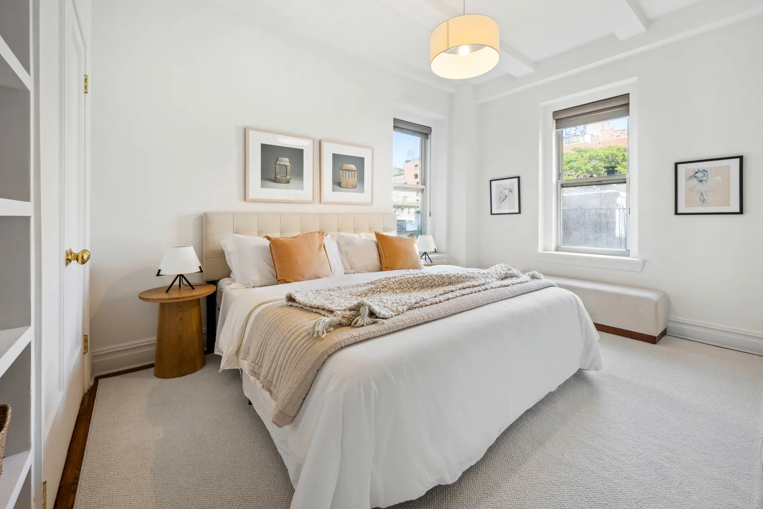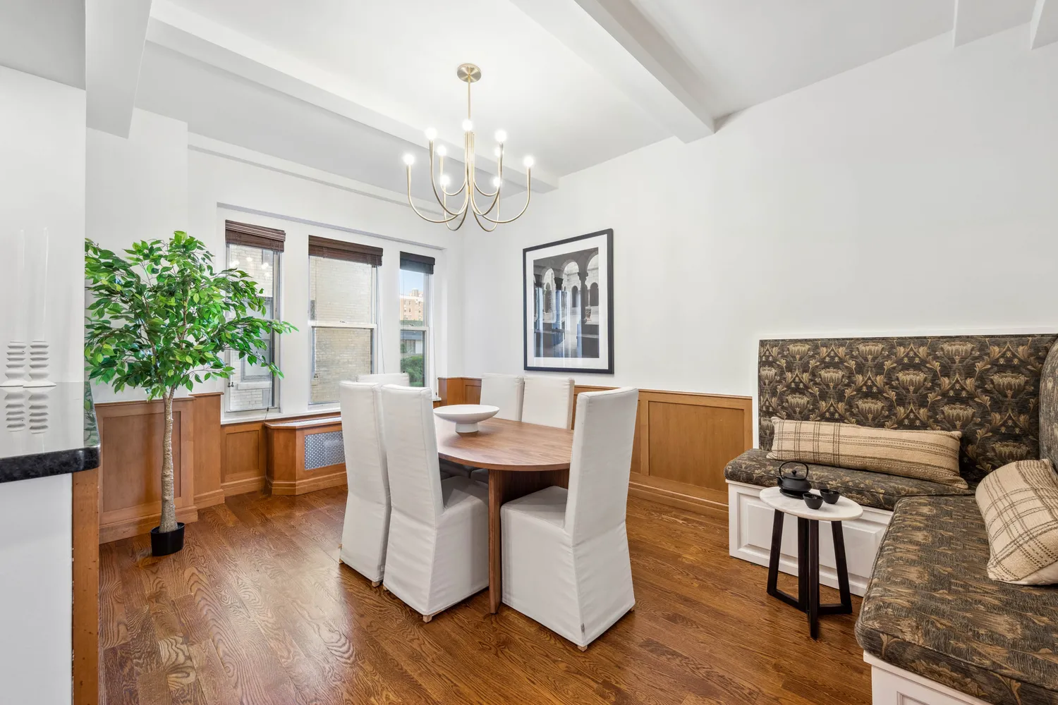 From the moment you enter the gracious entry foyer, you're greeted by soaring beamed ceilings,...Stellar Corner 2-Bedroom, 2-Bath Pre-War Condo on Lower Fifth’s Gold Coast