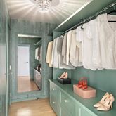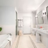 Off the foyer is the primary bedroom tucked comfortably away in the southwest corner of the apartment. The expansive bedroom retreat features gracious closets with custom built-ins and cabinetry. Southern exposures, overlooking quiet North Moore Street, add to the charm and volume of this room. The en-suite bath features dual vanities, a separate oversized glass-enclosed shower adorned in beautiful Waterworks floor tiling, and a deep soaking tub.