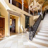 copper sink, baroque style mural, farmhouse kitchen sink, collectively exude...Immediately you are taken w/the chandelier, ornate archways, ascending stone staircase