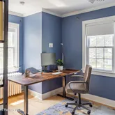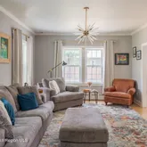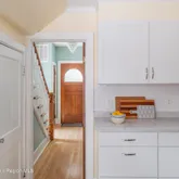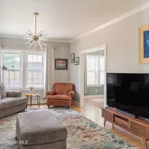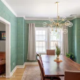 The first floor is full of natural light, with a roomy living and dining area that still shows off the original hardwood floors and wood moldings.