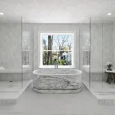 A striking floating staircase—set against a dramatic wall of glass—leads to the second level, where a stunning hallway overlooks the main living spaces below. The primary suite is a private retreat of exceptional scale with a balcony overlooking the grounds, an expansive closet, complemented by an additional room ideal for a private office or dressing room. The primary bathroom features a marble soaking tub this is an incredible piece of art, dual showers including a steam shower, and a custom +double vanity.