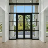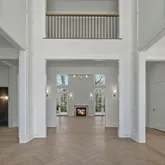 A dramatic glass entry door and stunning herringbone white oak floors set the tone, opening to a breathtaking double-height foyer where soaring ceilings and uninterrupted sightlines immediately captivate. At the center of the home, a sculptural marble fireplace anchors the space, framed by walls of glass that flood the interiors with natural light.