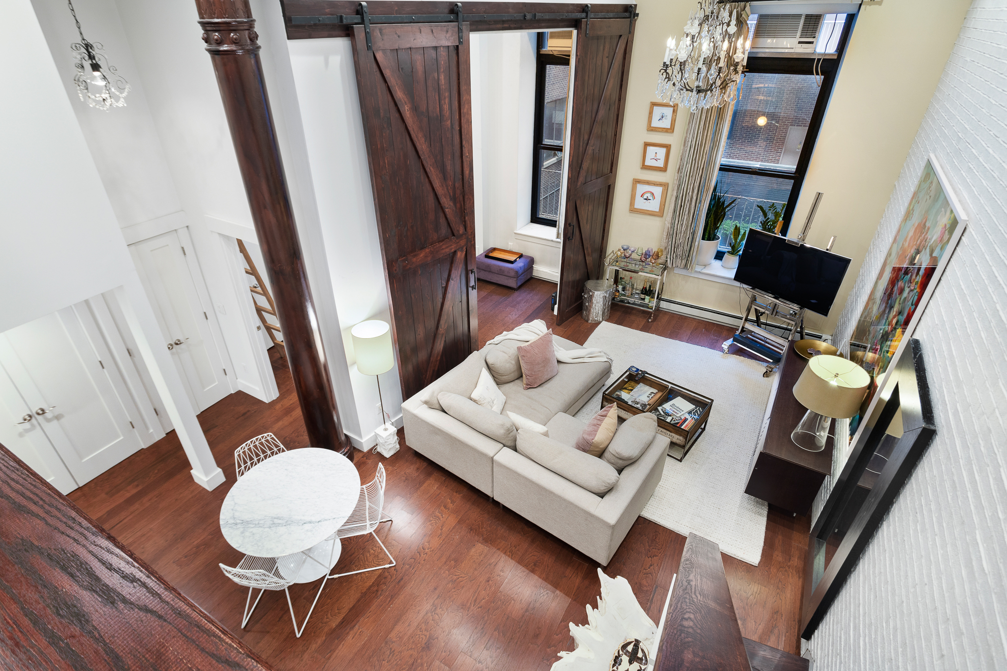 Following through to the living room, you will find yourself feeling a little smaller in the cavernous 17 foot high ceilings, Extra-large windows with matching white quartz sills, crystal chandelier above with separate dimmable recessed lighting, and custom 12 foot sliding barn doors!
