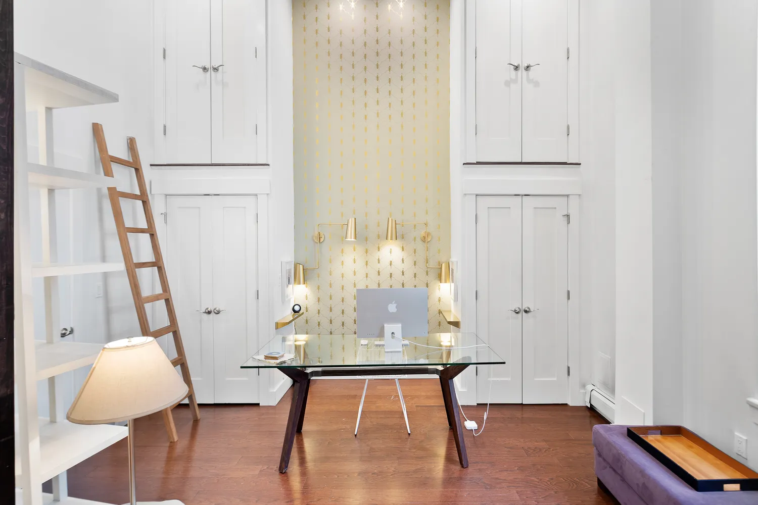 Just out of the living room is the first of 2 bedrooms, it features its own double stacked four large closets, custom golden wallpaper. Massive over-sized window, with matching quartz window-sill. Continuing on from the main floor bedroom past more custom Extra-large cabinets, into the stunning all marble bathroom with extra-large shower.