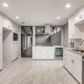 remodeled kitchen showcases custom cabinetry, granite countertops, and stainless steel appliances—including the