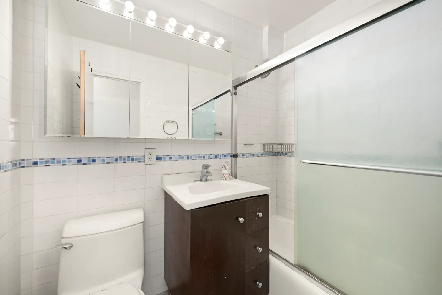 Sleep soundly in the king-size bedroom featuring a roomy closet and plenty of room for additional furnishings and a seating area. An adjacent full bathroom with a large tub/shower, vanity, and wide medicine cabinet completes this turnkey Kips Bay beauty.