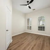 - Room Description: Spacious primary bedroom with plantation shutters and view of backyard.