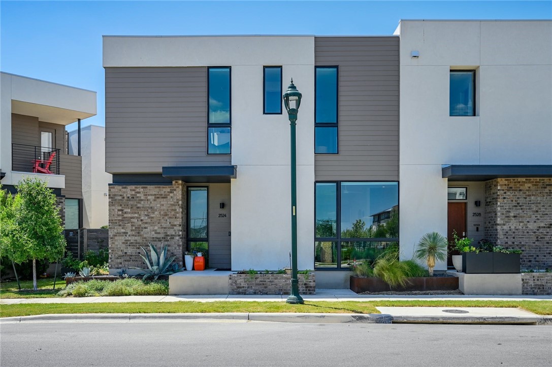 Built in 2020 by The Muskin Co, one of Austin's premier green home builders, this custom paired home is true modern living. This gorgeous home consists of 4 bedrooms, 3.5 bathrooms—an ensuite Guest bedroom DOWN and the Primary bedroom with private outdoor balcony and 2 Secondary bedrooms UP. The kitchen includes modern light fixtures, white quartz countertops, custom cabinets, and Bosch appliances. The open-concept living and large sliding glass doors that lead to a tiled patio allows for flexible and fun entertaining. Large nearly floor-to-ceiling windows throughout make this home feel bright and expansive. Architecture by award-winning Jay Corder Architecture and interiors designed by Kelle Contine known for bright, contemporary living spaces inspired by natural materials. Ideally situated on a corner lot across from Jessie Andrews Park—an extension of your own backyard!