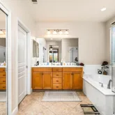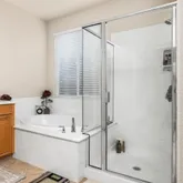- Bathroom: Shower over Tub - 1, Double Sinks, Solid Surface, Full on Ground Floor, Primary - Oversized Tub, Primary - Stall Shower(s)