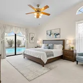 - Interior Features: Ceiling Fan(s), High Ceilings, Kitchen/Family Room Combo, Primary Bedroom Main Floor, Solid Surface Counters, Split Bedroom, Thermostat