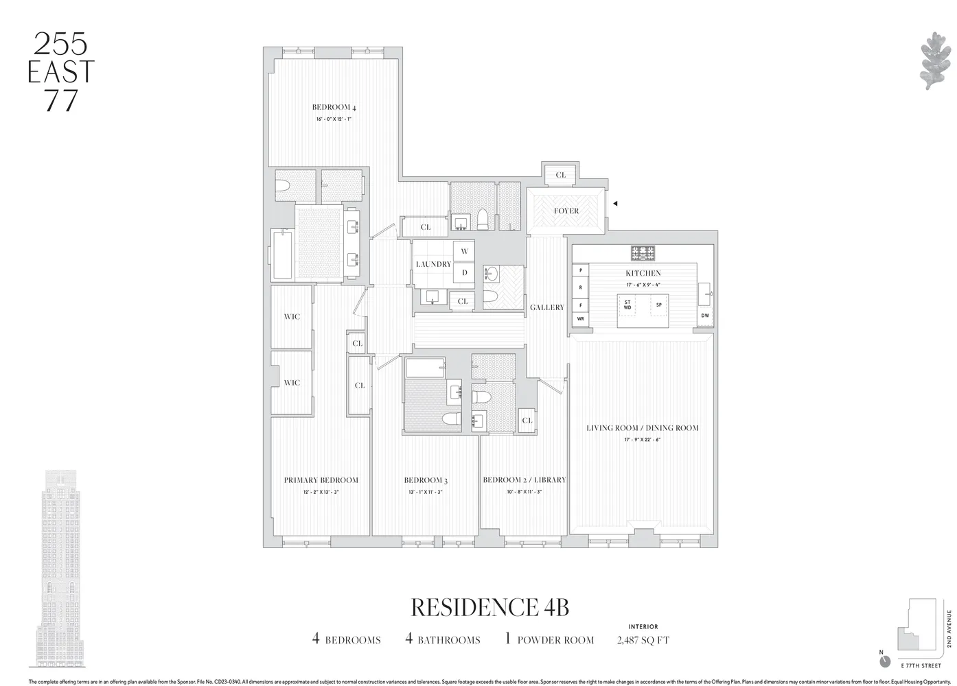 The Yabu Pushelberg-designed public spaces and amenities, bring a fresh and vibrant point of view while still respecting the Upper East Side sensibility. In the tower, a seventy-five-foot swimming pool with soaring ceilings and beautiful views is the centerpiece of a collection of comprehensive wellness and entertainment spaces designed with a hospitality perspective, including a fitness center, yoga room, spa with steam room and sauna, and a massage/treatment room. A library in the sky with a charming fireplace opens to a dramatic outdoor space. Additional building amenities are all designed at the highest level with something for everyone, including a cinema, a sports simulator, a kids club space, and a soundproof music practice room with a recording studio. Beyond the gates of the porte-cochere, there is a concealed automated parking system at ground level. The lobby will be attended 24 hours a day with a doorman and concierge service. The complete offering terms are in an offering plan available from the sponsor, file number CD23-0340.