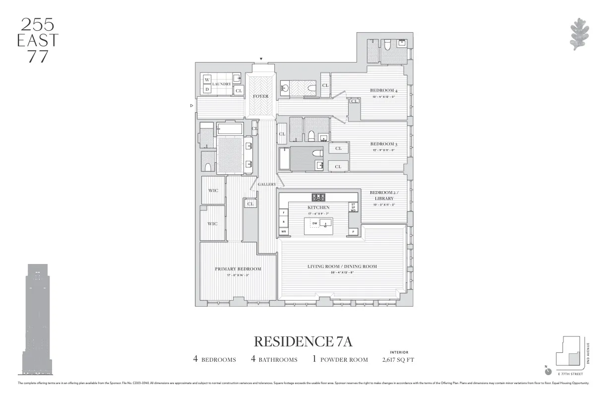The Yabu Pushelberg-designed public spaces and amenities, bring a fresh and vibrant point of view while still respecting the Upper East Side sensibility. In the tower, a seventy-five-foot swimming pool with soaring ceilings and beautiful views is the centerpiece of a collection of comprehensive wellness and entertainment spaces designed with a hospitality perspective,, including a fitness center, yoga room, spa with steam room and sauna, and a massage/treatment room. A library in the sky with a charming fireplace opens to a dramatic outdoor space. Additional building amenities are all designed at the highest level with something for everyone, including a cinema, a sports simulator, a kids club space, and a soundproof music practice room with a recording studio. Beyond the gates of the porte-cochere, there is a concealed automated parking system at ground level. The lobby will be attended 24 hours a day with a doorman and concierge service. The complete offering terms are in an offering plan available from the sponsor, file number CD23-0340.