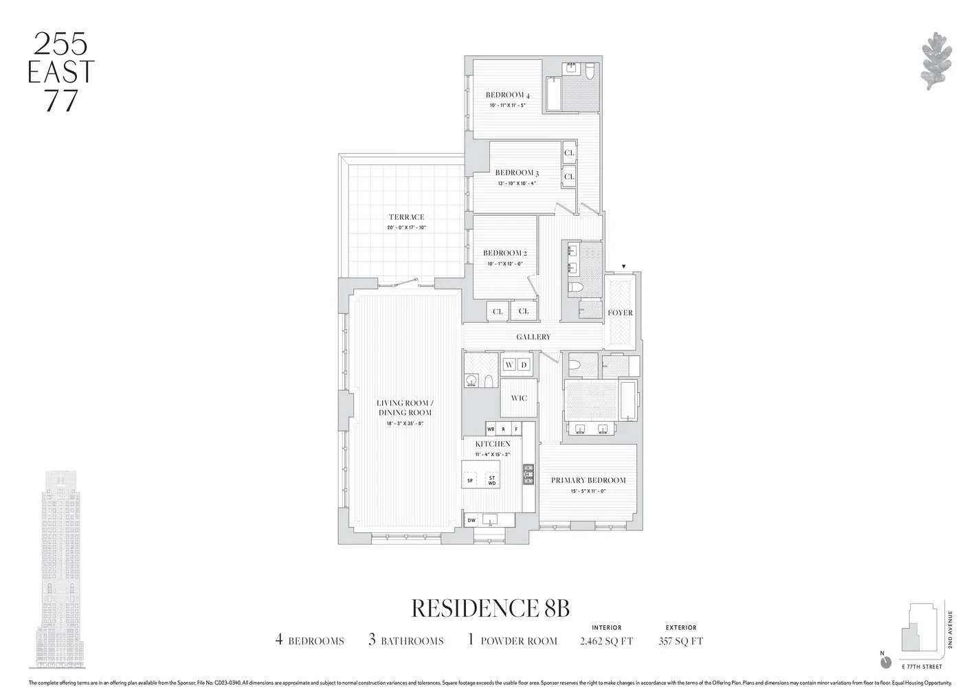 The Yabu Pushelberg-designed public spaces and amenities, bring a fresh and vibrant point of view while still respecting the Upper East Side sensibility. In the tower, a seventy-five-foot swimming pool with soaring ceilings and beautiful views is the centerpiece of a collection of comprehensive wellness and entertainment spaces designed with a hospitality perspective, including a fitness center, yoga room, spa with steam room and sauna, and a massage/treatment room. A library in the sky with a charming fireplace opens to a dramatic outdoor space. Additional building amenities are all designed at the highest level with something for everyone, including a cinema, a sports simulator, a kids club space, and a soundproof music practice room with a recording studio. Beyond the gates of the porte-cochere, there is a concealed automated parking system at ground level. The lobby will be attended 24 hours a day with a doorman and concierge service. The complete offering terms are in an offering plan available from the sponsor, file number CD23-0340.