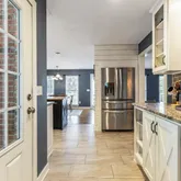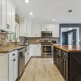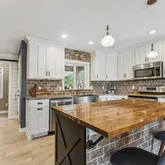 Main-level primary suite with ensuite bath | Dedicated home office | Additional den/flex space | Beautifully designed kitchen with quartz countertops, butcher-block island, oversized pantry, coffee station, and stainless-steel appliances | Cozy family room with high-efficiency wood-burning fireplace.