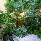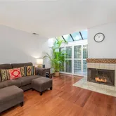 As you step inside, you are greeted by a thoughtfully designed open-concept living area illuminated by skylights and natural light. The living area features a cozy fireplace, kitchen, dining area and a half bath, creating a warm and inviting atmosphere. Large sliding doors with plantation shutters lead you to an enchanting serene outdoor patio enveloped by mature landscaping for relaxation and entertainment.