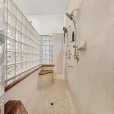 elegant bath with a large shower and a delightful soaking tub, along with two spacious closets. The interior is adorned with beautiful travertine