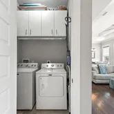 The kitchen comes fully equipped with modern appliances, complemented by a private outdoor space where you can savor your morning coffee or evening cocktails. The unit also includes a washer/dryer for added convenience.
