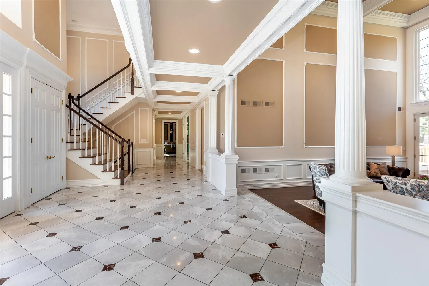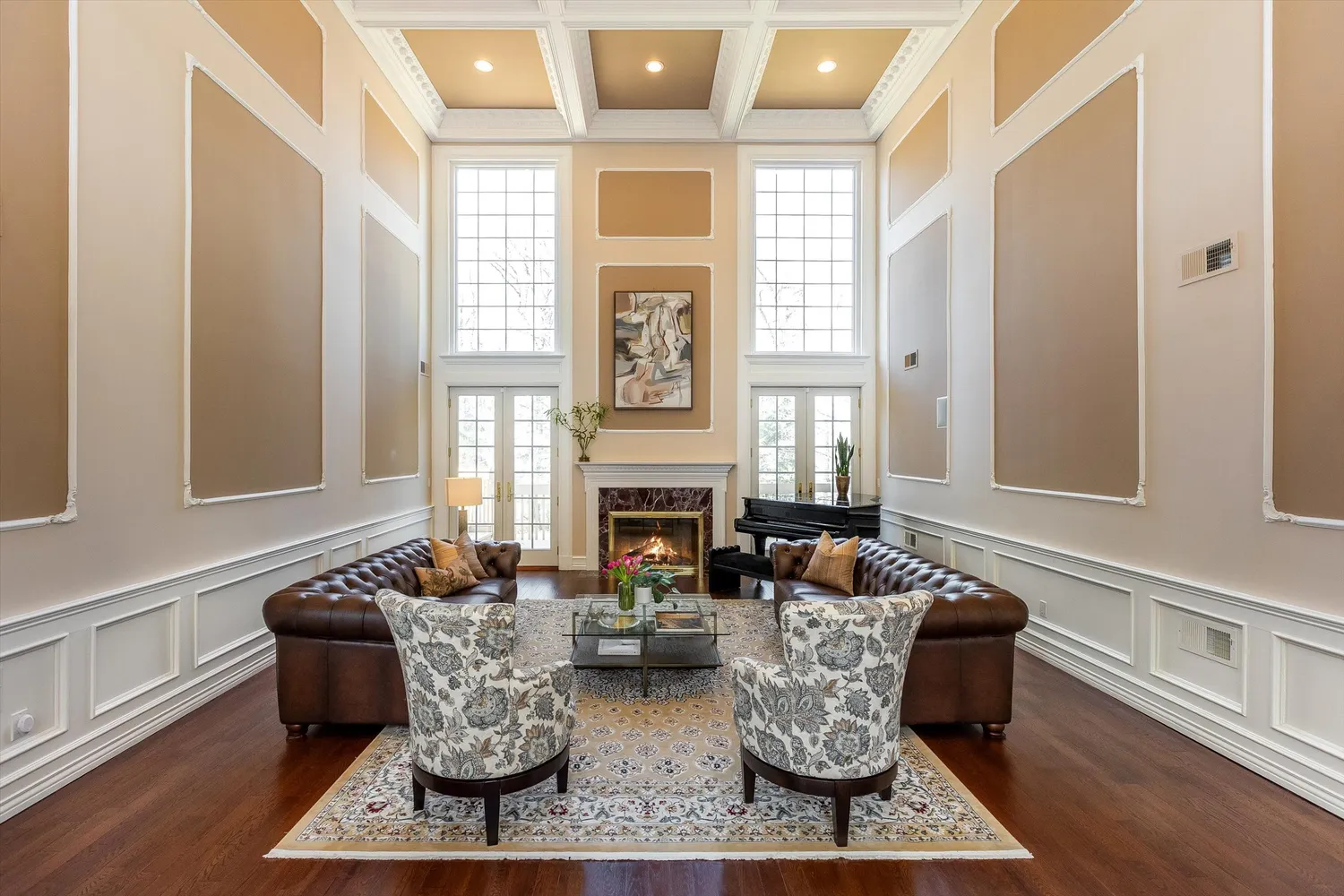 A striking marble foyer establishes a dramatic arrival, anchored by a sweeping bridge that visually connects the upper level to the home’s main living spaces. Just beyond, the Great Room is defined by soaring coffered ceilings, refined millwork, and a wood-burning fireplace, while a wall of Palladian-topped French doors and windows draws in natural light and opens to an oversized deck overlooking the lush backyard.