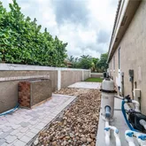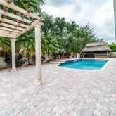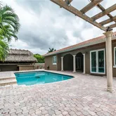 cooktop appliances great for hosting and entertaining guests. The backyard features a pergola, swimming pool, and large tiki hut with a built-in sink. Complete storm protection with high-impact windows and doors as well as a security system and cameras throughout the exterior of the property. The corner lot features 12,500 sqft with a porte-cochere entrance in the driveway.