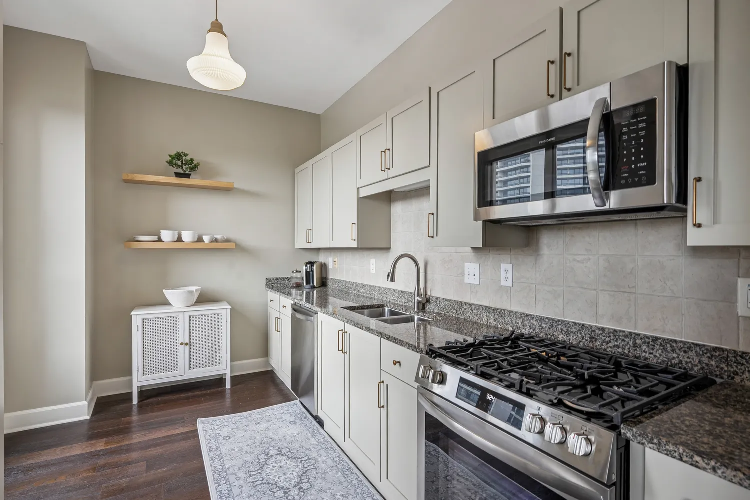 Inside, soaring floor-to-ceiling windows bathe the open-concept living and dining areas in natural light, while the private patio invites you to unwind amidst the quietude of the city skyline. The chef’s kitchen is finished with polished granite countertops, a gas range, and ample storage, creating a perfect balance of function and elegance.