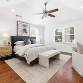 The oversized primary suite feels like a true retreat, complete with vaulted ceilings, a walk-in closet featuring a well-designed closet system, and a beautifully renovated bath. Dual vanities with stone countertops, a soaking tub, and a tiled walk-in shower create a spa-like escape at the end of the day. Every bathroom throughout the home has been updated, offering a cohesive, move-in-ready feel from top to bottom.