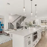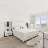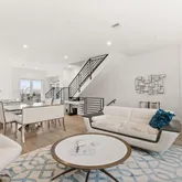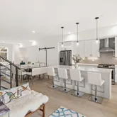 Upstairs on the second floor, you’ll find a large open-concept living space that seamlessly connects the living, dining, and kitchen areas—ideal for entertaining. The airy kitchen is outfitted with top-of-the-line appliances, a large pantry, and a peninsula with seating for four. A picture window over the sink fills the space with beautiful natural light and expansive views. Step out onto the balcony to enjoy fresh air and your morning coffee.