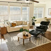 - Room Description: Spacious living room with soaring ceilings, wood-like flooring, and plenty of natural light from large windows.