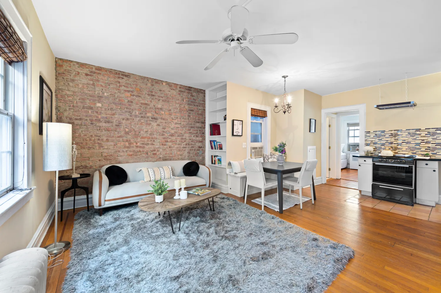 This second floor unit has a direct view on to the walk. Original details abound from the exposed brick, to the hardwood floors and amazing East and West light streaming in through Tudor style windows. The unit has recently updated electrical. a galley kitchen with dishwasher, a skylight, custom banquette seating with storage beneath, as well as gorgeous custom bookshelves and storage in the living room. The renovated bathroom is stylish and features tile work, a shower and soaking tub combination and a window. The pin-drop quiet bedrooms are removed from the living area, Enjoy your morning coffee on your stoop out front, while you gaze at the lovely flowers and plantings right outside your door. You will fall in love with this one of a kind storybook of a home.