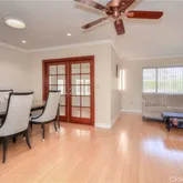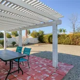 Welcome to this highly sought-after single-story home located in the beautiful 55+ community of Menifee. This updated, bright, and open floor plan offers both comfort and style. The spacious kitchen features Corian countertops, matching wood cabinetry, a tiled backsplash, and plenty of storage. The home boasts wood laminate flooring, recessed lighting, ceiling fans, plantation shutters, and elegant crown molding throughout. The primary suite offers a generous bedroom, walk-in closet, and an upgraded bathroom with a beautifully tiled walk-in shower. Two additional well-sized bedrooms and a full bathroom provide ample space for guests or a home office. Enjoy a bright and airy living room, dining area, plus a large second living space—perfect for relaxing or entertaining. The laundry room is conveniently located in the workshop area at the rear of the garage. Step outside to a spacious low-maintenance backyard with an Alumawood patio cover—ideal for outdoor gatherings and family entertaining. Conveniently located near the 215 Freeway, shopping centers, and restaurants. Community amenities include a fitness center, two swimming pools, hot tub, meeting room, and more.