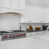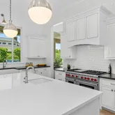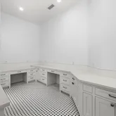 The gourmet kitchen boasts quartz countertops, high-end Sub-Zero and Wolf appliances, including a 6-burner gas range with double oven, and undercounter refrigerator drawers. The spacious kitchen island includes a separate ice maker, additional sink, and plenty of extra storage space.