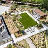 features, new beautiful garden with event lawn, water and fire features and grill pavilion with dining area,