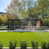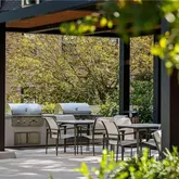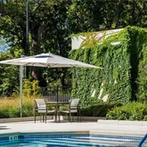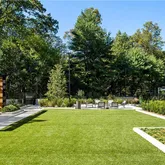 saltwater pool with newly expanded pool deck and shade features, new beautiful garden with event lawn, water