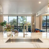 The chef’s kitchen is a showstopper, featuring custom cabinetry, a striking stone waterfall island with breakfast bar seating and hidden storage, a Wolf range and oven, Jenn-Air refrigerator/freezer, built-in microwave, and a new GE Café dishwasher. Just beyond, a built-in dry bar creates the perfect setting for hosting with ease. Step outside to the expansive main balcony, ideal for al fresco dining or evening cocktails.