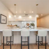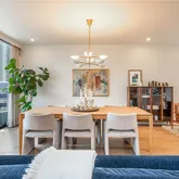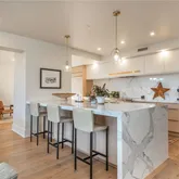 The redesigned open-concept floorplan seamlessly connects the kitchen, dining, and family room, all anchored by rich hardwood floors, designer lighting, and custom linen electric drapery with blackout shades for effortless ambiance and privacy.