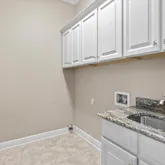 A laundry room with cabinets and a granite-topped utility sink