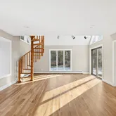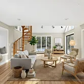 skylights, and elegant spiral wood staircases. The chef’s kitchen opens seamlessly to a spacious living room with a travertine fireplace, perfect for