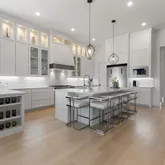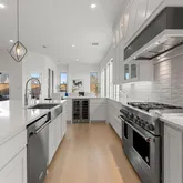The light-filled kitchen & living areas showcase elevated finishes throughout. An oversized island anchors the space, complemented by a 48-inch built-in refrigerator, wine & beverage refrigerator, premium KitchenAid appliances, ceiling-height cabinetry, additional windows added to capture the greenbelt and water views & designer lighting that enhances the home’s clean, modern aesthetic.