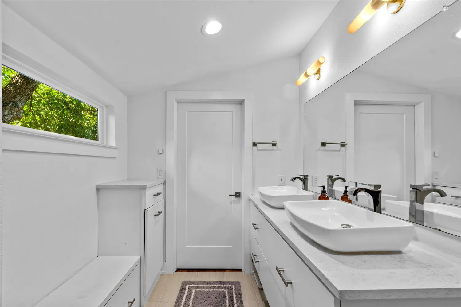 The elevated entry stairs create a sense of peace and seclusion—you walk up surrounded by trees, with light pouring in on both levels. Inside, American walnut floors, custom wood accents, and high-end finishes highlight the open layout.