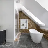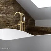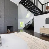 The upper level, divided by the central staircase, includes three spacious bedrooms and a beautifully appointed bath with deep soaking tub and glass-enclosed shower in addition to the sweeping primary suite with cathedral ceilings, brick fireplace, and a loft overlooking the suite which is perfect for a reading nook, meditation space, or quiet work corner. The primary bath, clad in marble with a freestanding tub, offers a spa retreat.