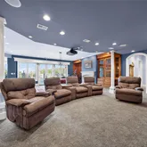 - Room Description: Media room/recreation area, ceiling-mounted projector, projection screen, pool table area fireplace & custom built in glass front cabinets