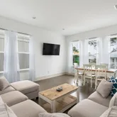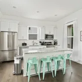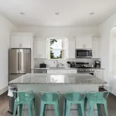 The first floor has an open kitchen, dining, and living area. Kitchen is equipped with all new KitchenAid appliances including gas stove, microwave, dishwasher, and full fridge with bottom freezer. You will also find all pots and pans you may need and a blender for your frozen cocktails! Outside is a charcoal grill, and a few steps away at the community pool there are gas grills for use.