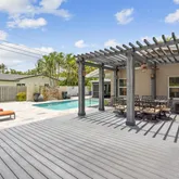 Situated on an expansive, fully fenced corner lot, it boasts a marble patio & deck, sparkling pool, 20-foot waterfall fountain, hot tub perfectly placed for moonrise views, screened-in patio, a raised Trex deck w/ pergola, Premium materials imported from Bali